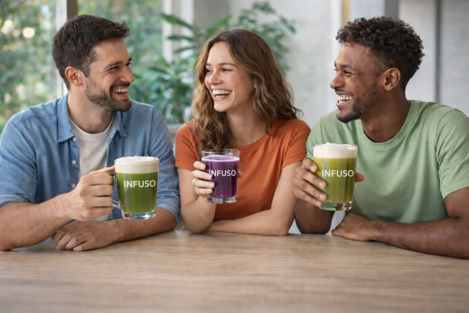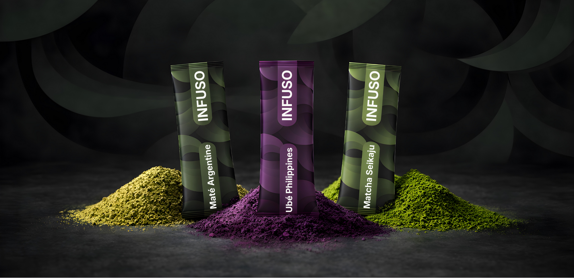 Matcha, Maté et Ube, sélectionnés pour leurs saveurs et leurs usages complémentaires, en format stick.